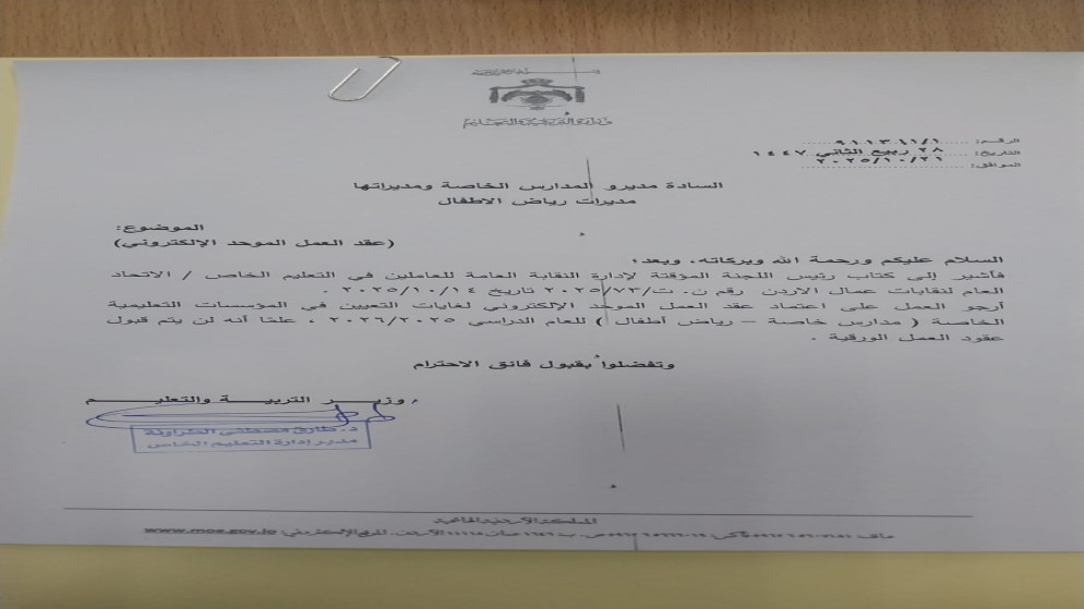 وشدد وزير التربية والتعليم في كتابه الموجه إلى مديري ومديرات المدارس الخاصة ورياض الأطفال، ضرورة الالتزام بالعقد الإلكتروني الموحد للعاملين اعتبارا من العام الدراسي الحالي، مشيرا إلى أنه لن يُقبل بعد الآن استخدام العقود الورقية في التعيينات الجديدة.