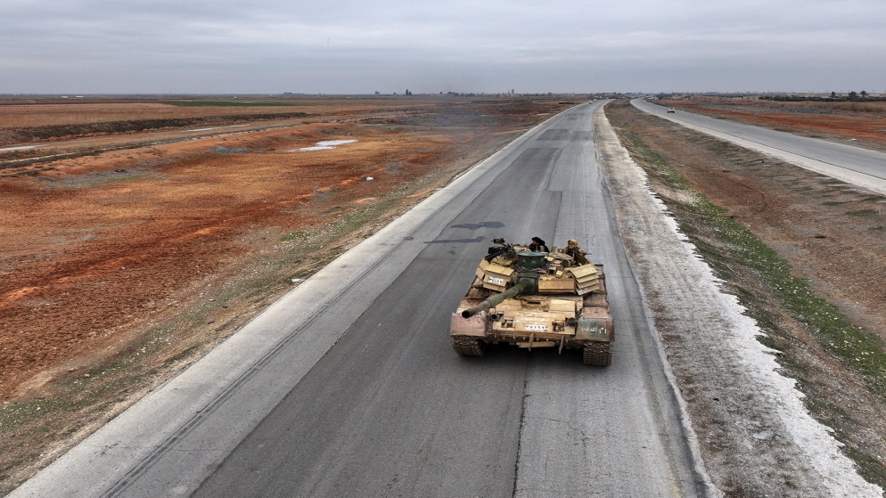 دبابة تابعة للجيش السوري تسير على الطريق في دبسي أفنان، في 17 كانون الثاني 2026. (أ ف ب)