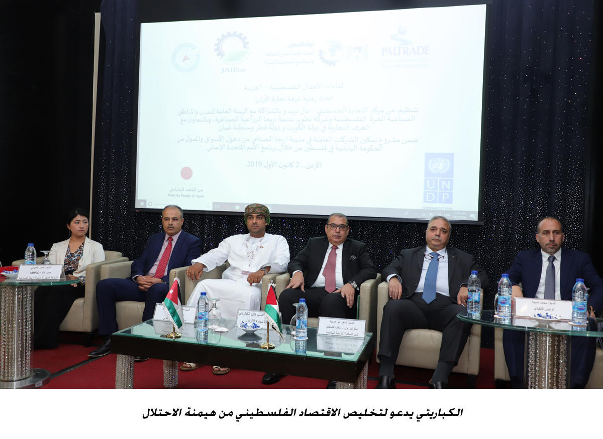 وشدد الكباريتي على ضرورة "البدء أولا بسلخ الاقتصاد الفلسطيني عن اقتصاد دولة الاحتلال وإعادته إلى محيطه العربي والأسلامي من خلال المساعدة في فتح الأسواق أمام المنتجات الفلسطينية وتوفير كل التسهيلات لتمكينها من الوصول للأسواق الخارجية".