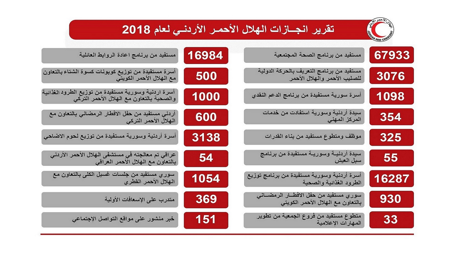 وقالت الجمعية في بيان صحفي الاثنين، استعرضت خلاله انجازاتها على مدار العام الماضي، إنه تم تعريف 30 ألفا بالحركة الدولية للصليب الأحمر والهلال الأحمر واستفادت أكثر من 10 آلاف أسرة سورية من برنامج الدعم النقدي واستفادت 354 سيدة أردنية وسورية من خدمات المركز المهني التابع للجمعية، و55 سيدة أردنية وسورية من برامج سبل العيش.