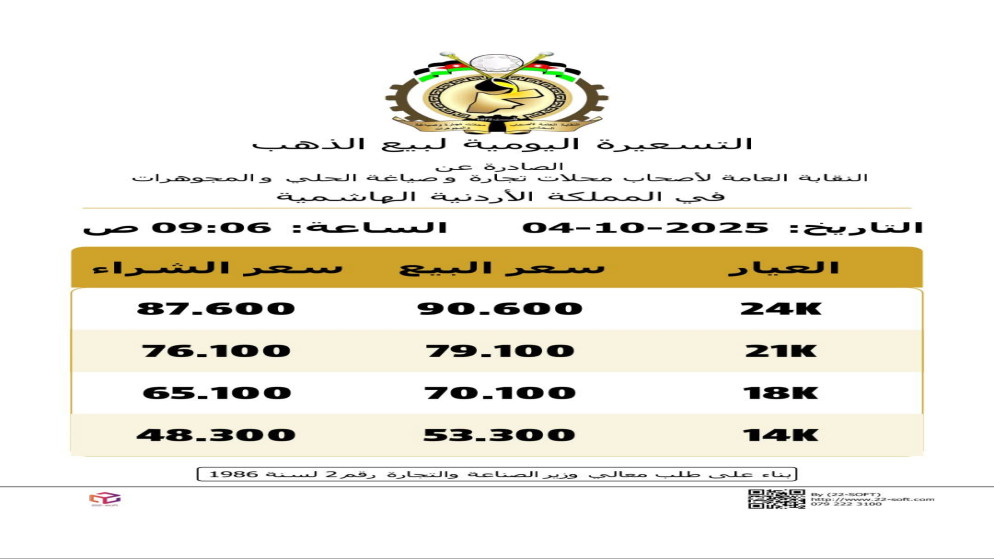 وحسب النشرة اليومية التي أصدرتها النقابة العامة لأصحاب محلات تجارة وصياغة الحلي والمجوهرات، بلغ سعر الغرام الواحد من الذهب عيارات 24 و 18 و14 لغايات البيع من محلات الصاغة عند 90.6 دينارا و70.10 و53.30 دينارا على التوالي.