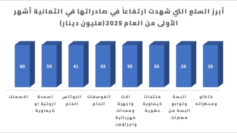 وأشارت الغرفة إلى أن المنتجات التي شكّلت المحرك الرئيس لنمو الصادرات الصناعية خلال الأشهر الثمانية الأولى من العام الحالي شملت منتجات الأسمنت والأسمدة الكيماوية، والفوسفات، والبوتاس الخام، إضافة إلى المنتجات الكيماوية، والمنتجات الغذائية، والألبسة، مما عكس التنوع في الصادرات وقوة القاعدة الإنتاجية الوطنية واتساع نطاقها القطاعي، فضلًا عن قدرة الصناعات الأردنية على المنافسة في الأسواق الخارجية بمنتجات تتميز بالجودة والالتزام بالمواصفات العالمية.