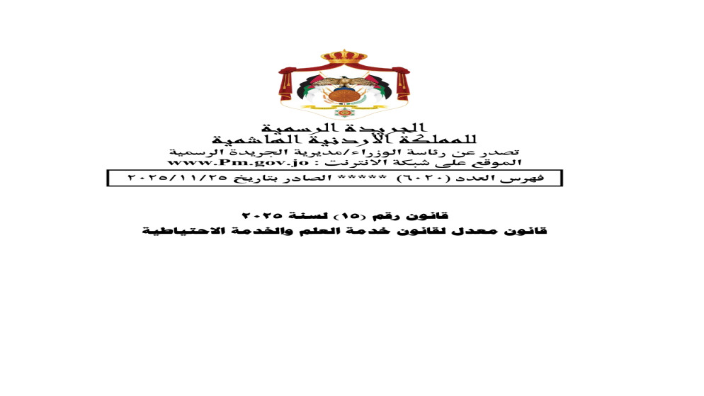 نشرت الجريدة الرسمية في عدد خاص، القانون المعدل لقانون خدمة العلم والخدمة الاحتياطية، بعد إقراره من مجلسي النواب والأعيان، ليصبح نافذاً من تاريخ نشره.