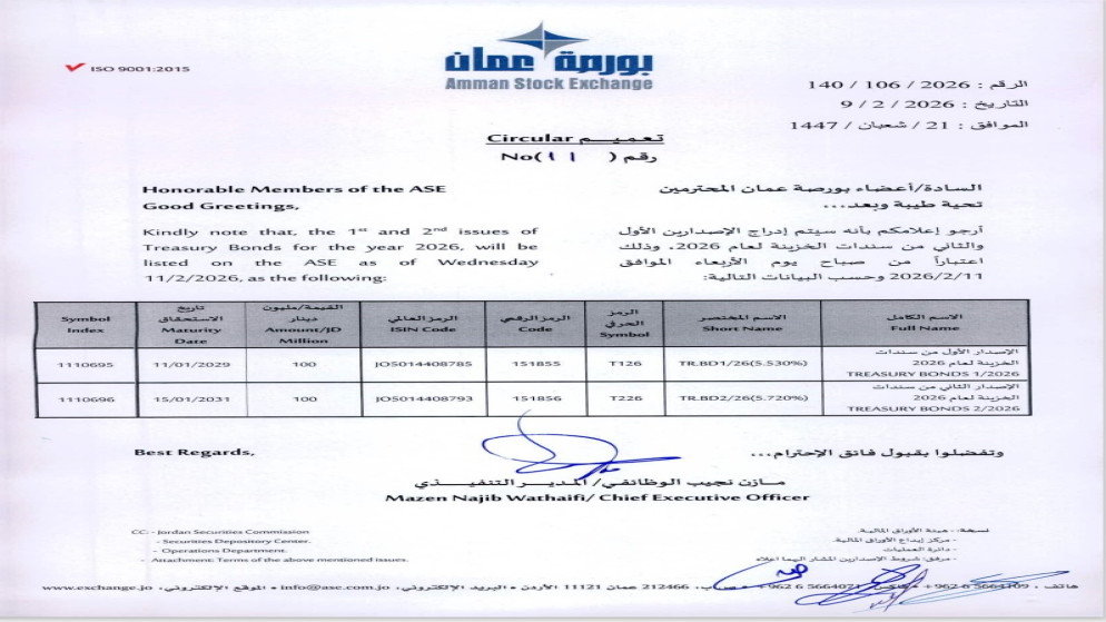 قالت بورصة عمّان، في تعميم صادر، عنها إنه سيتم الأربعاء إدراج الإصدارين الأول والثاني من سندات الحزينة للعام 2026.