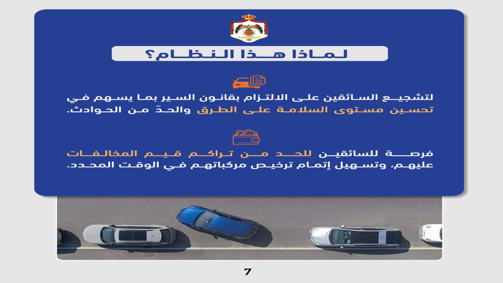 - مشروع النظام يهدف إلى تشجيع السائقين على الالتزام بقانون السير بما يسهم في تحسين مستوى السلامة على الطرق والحدّ من الحوادث.