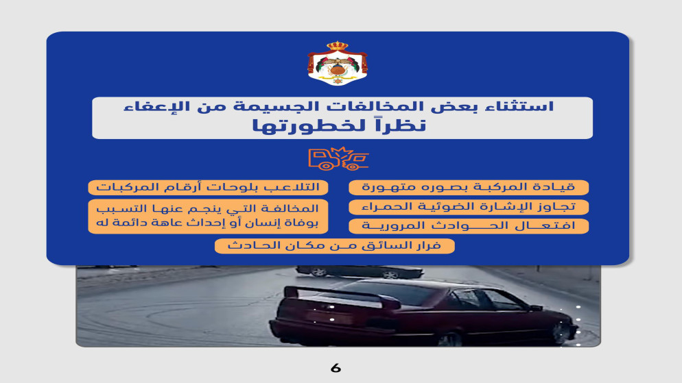 - استثناء المخالفات الجسيمة من الخصم؛ نظراً لخطورتها مثل: قيادة المركبة بصوره متهورة، وتجاوز الإشارة الحمراء، وافتعال الحوادث المرورية، وفرار السائق من مكان الحادث، والتلاعب بلوحات أرقام المركبات، والمخالفة التي ينجم عنها التسبب بوفاة إنسان أو إحداث عاهة دائمة له.