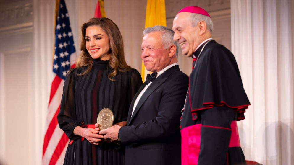 تسلم جلالة الملك عبدالله الثاني وجلالة الملكة رانيا العبدالله، الاثنين في نيويورك، جائزة "الطريق إلى السلام"، التي تُمنح من قبل مؤسسة الطريق إلى السلام التابعة لبعثة الفاتيكان في الأمم المتحدة.